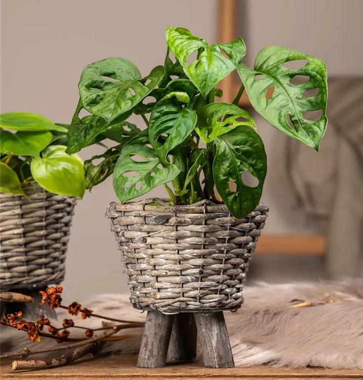 Das Fensterblatt 'Monkey Leaf' (Monstera obliqua) trägt dunkelgrüne Blätter. Diese rankende Pflanze gedeiht am besten an einem halbschattigen Standort.
