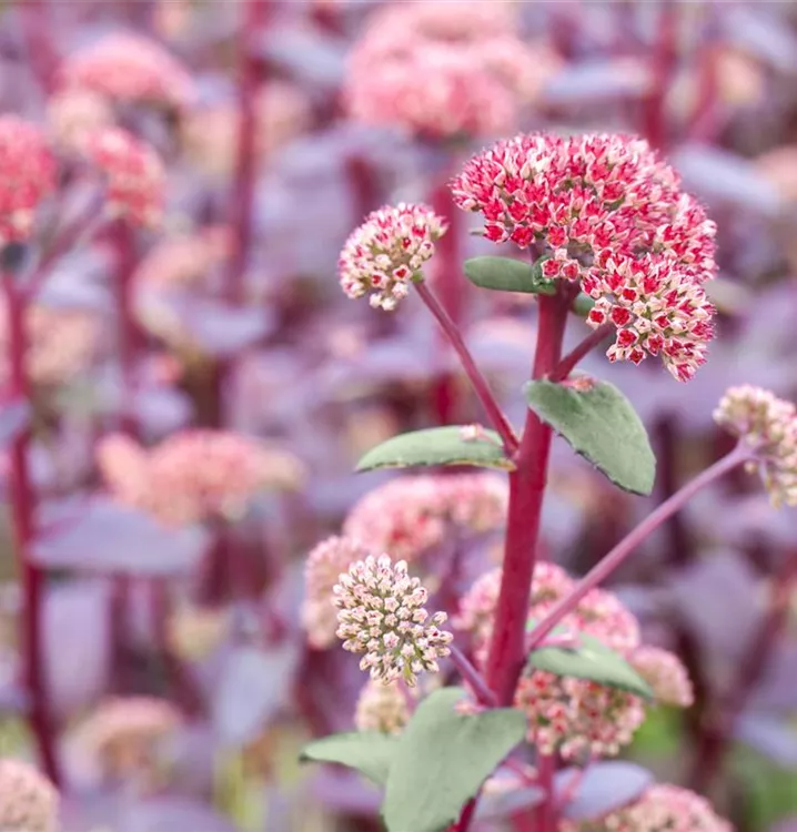 Sedum telephium 'Red Cauli'® bildet in Dolden angeordnete, rote Blüten ab August.