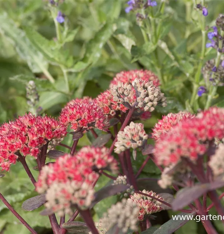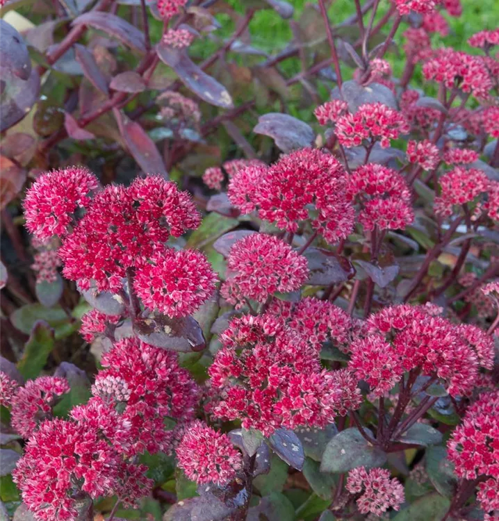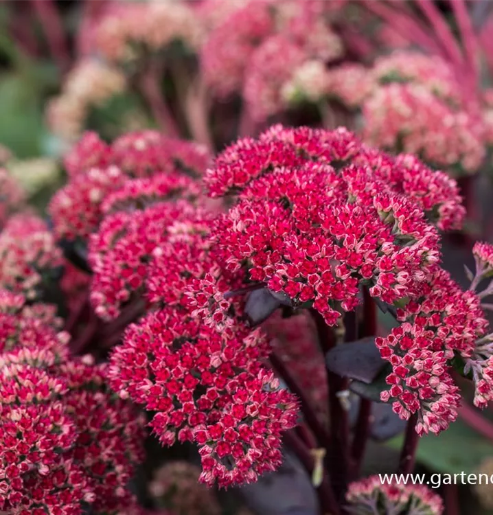 Das Große Garten-Fettblatt 'Red Cauli'® (Sedum telephium) ist eine buschige Staude, die von August bis Oktober rote, in Dolden angeordnete Blüten bildet. An einem sonnigen Standort mit durchlässigem, nährstoffreichem Boden erreicht es gewöhnlich eine Höhe von ca. 30 cm und wird ca. 30 cm breit. Das Große Garten-Fettblatt 'Red Cauli'® ist gut frostverträglich.