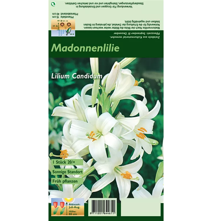 Welch eine Pracht, wenn die Madonnen-Lilie ab Juni ihre herrlichen, weißen, trichterförmigen Blüten hervorbringt! Das Besondere: sie verbreiten einen starken Duft. Über den mittelgrünen, lanzettlichen Blättern kommen die Blüten besonders gut zur Geltung. Wird Lilium candidum an einen sonnigen bis halbschattigen Standort mit durchlässigem und humosem Boden gepflanzt, entwickelt sie sich besonders gut. Sie wächst aufrecht und erreicht Größen von 80 cm bis 1 m bei einer Breite von 20 cm bis 25 cm. Sehr dekorativ macht sich die Madonnen-Lilie auch in Kübeln oder Kästen. Lilium candidum hat sich als besonders pflegeleicht erwiesen.