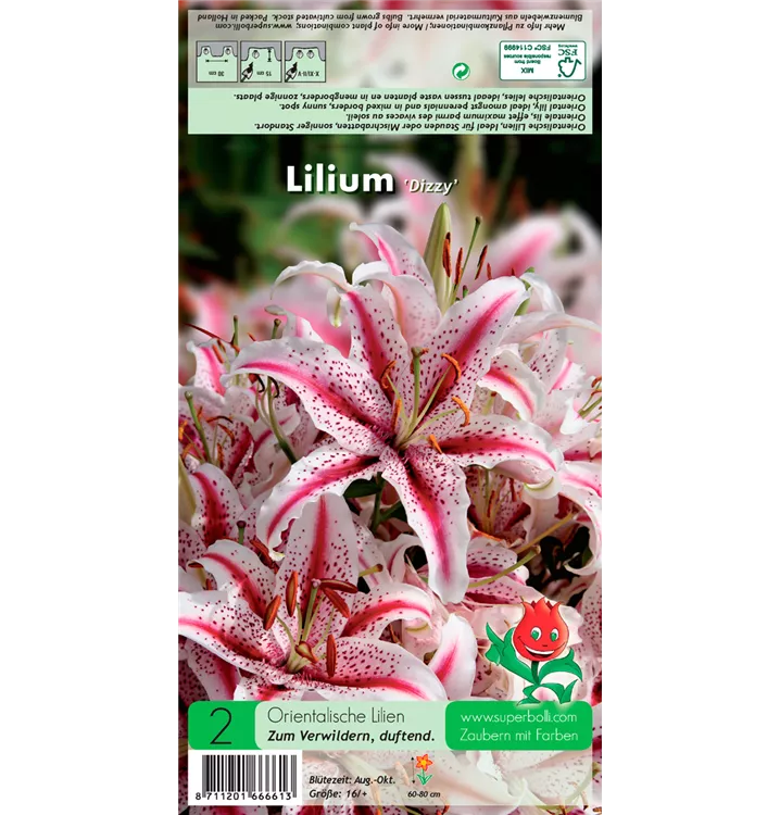 Welch eine Pracht, wenn die Orientalische Lilie 'Dizzy' ab August ihre herrlichen, rot-weißen, trichterförmigen Blüten hervorbringt! Das Besondere: sie verbreiten einen starken Duft. Über den dunkelgrünen, lanzettlichen Blättern kommen die Blüten besonders gut zur Geltung. Wird Lilium 'Dizzy' an einen halbschattigen Standort mit nährstoffreichem und sandigem Boden gepflanzt, entwickelt sie sich besonders gut. Sie wächst aufrecht und erreicht Größen von 60 cm bis 80 cm bei einer Breite von 20 cm bis 25 cm. Auch als Zimmerpflanze eignet sich die Orientalische Lilie 'Dizzy' sehr gut. Lilium 'Dizzy' hat sich als besonders pflegeleicht erwiesen.