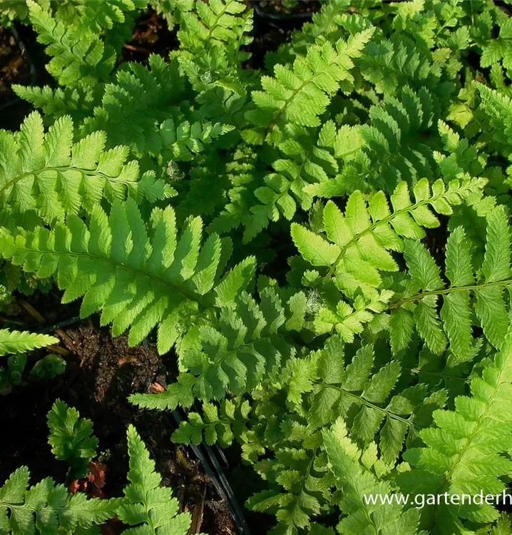 Hoher Blattschmuckwert. Die sommergrünen Blätter des Schwertfarns sind mittelgrün, gefiedert.