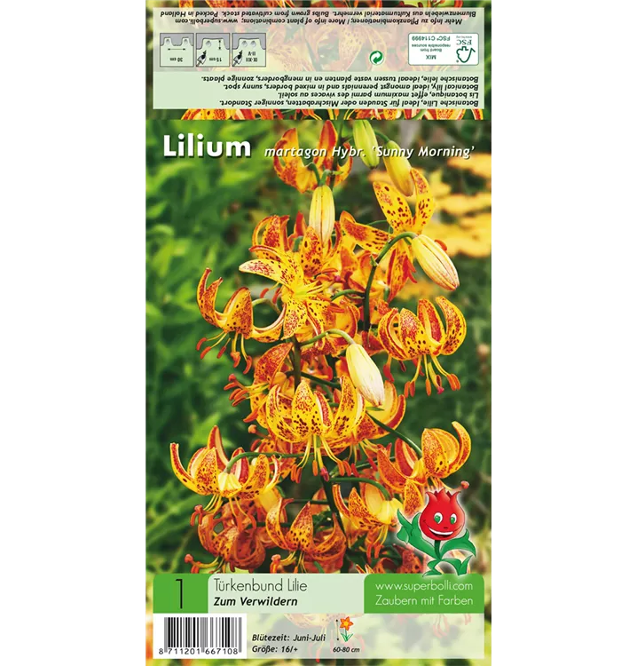 Welch eine Pracht, wenn die Türkenbund-Lilie 'Sunny Morning' ab Juni ihre herrlichen, gepunkteten, trichterförmigen Blüten hervorbringt! Das Besondere: sie verbreiten einen angenehmen Duft. Über den mittelgrünen, lanzettlichen Blättern kommen die Blüten besonders gut zur Geltung. Wird Lilium martagon 'Sunny Morning' an einen sonnigen bis halbschattigen Standort mit durchlässigem, kalkhaltigem und nährstoffreichem Boden gepflanzt, entwickelt sie sich besonders gut. Sie wächst aufrecht und erreicht Größen von 60 cm bis 80 cm bei einer Breite von 20 cm bis 30 cm. Sehr dekorativ macht sich die Türkenbund-Lilie 'Sunny Morning' auch in Kübeln oder Kästen. Lilium martagon 'Sunny Morning' hat sich als besonders pflegeleicht erwiesen.