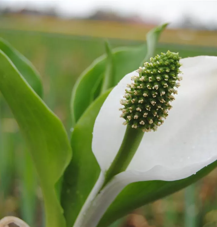 Die weißen, trichterförmigen Blüten der Weißen Scheinkalla erscheinen in Kolben von April bis Mai.