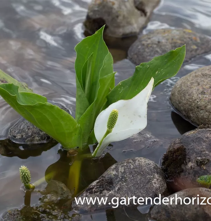 Die Weiße Scheinkalla (Lysichiton camtschatcensis) ist mit ihren mittelgrünen Blättern eine ausgesprochen dekorative Wasserpflanze, die für solche Einsatzbereiche wie Schnitt, Bienenweide, Teichrand, Bachlauf, Teich und Staudenbeet besonders gut geeignet ist. Die Blüten erscheinen, je nach Sorte, in vielen Farben von April bis Mai. Sie bevorzugt humosen, kalkfreien Boden in halbschattiger Lage. Die Weiße Scheinkalla ist gut frostverträglich. Die horstbildende Staude erreicht gewöhnlich eine Höhe von ca. 50 cm.