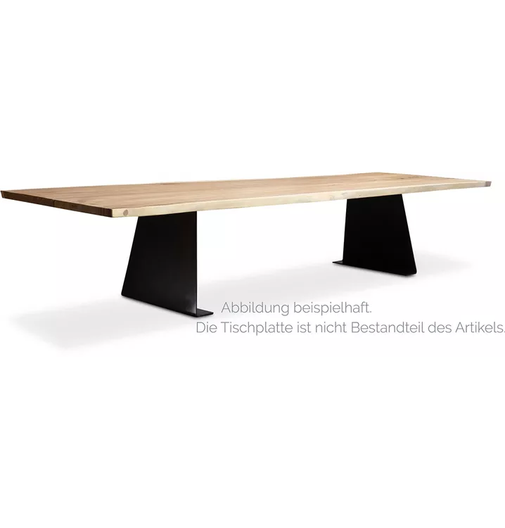 Das Tischgestell ist aus schwarzem, pulverbeschichtetem Carbon. Der Fuß liegt zum einen durch sein Gewicht und zum anderen mit einer Breite von 80 cm und einer Tiefe von 10 cm Tiefe sehr stabil auf dem Boden. Das Untergestell in Trapez-Form mit einer Höhe von 78 cm bietet somit gleichzeitig eine stilvolle Basis für die massiven Baumstammtische.