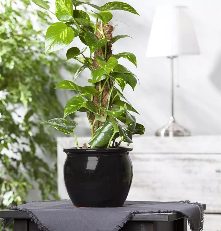 Die Goldene Efeutute (Epipremnum aureum) trägt mehrfarbige, herzförmige Blätter. Diese kriechende bzw. kletternde Pflanze gedeiht am besten an einem sonnigen bis halbschattigen Standort.