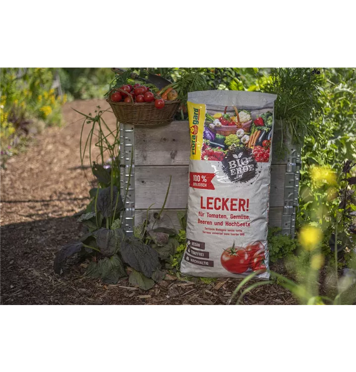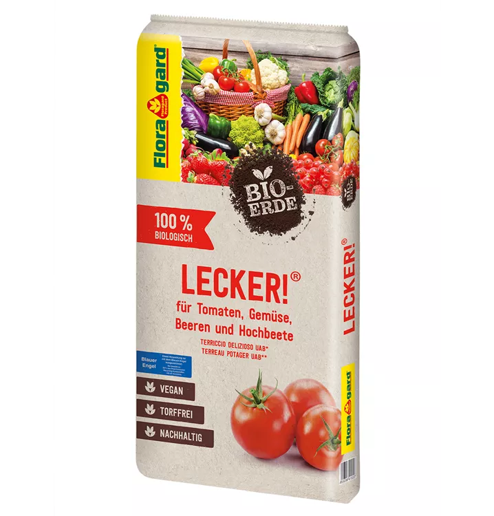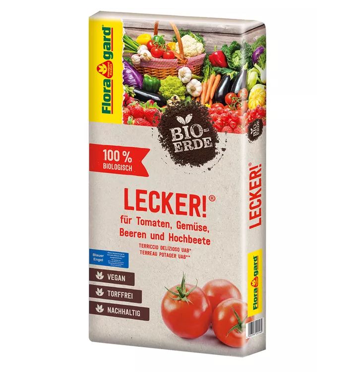 Die Floragard Bio-Erde LECKER! Doch warum „lecker“? Du stehst auf natürlichen und unverfälschten Geschmack? Du liebst es, deinem liebevoll gepflegten Gemüse beim Wachsen zuzusehen? Diese torffreie und vegane Bio-Erde kannst du für alle Gemüsepflanzen verwenden – egal ob im Gewächshaus, im Beet oder im Kübel. Wenn der Tag der Ernte gekommen ist und du dein eigenes Gemüse genießt, dann heißt es: Ist das lecker! Ideal für köstliches und gesundes Bio-Gemüse wie Tomaten, Auberginen, Paprika, Chili oder Zucchini aus eigener Ernte. Auch für Salat, Knoblauch, Zwiebeln, Beerenobst und Säulenobst geeignet. Natürlich und vegan – unbedenklich für Mensch und Tier Natürlichkeit ist dir wichtig? Dann hast du dich für die richtige Erde entschieden! Die Floragard Bio-Erde Lecker besteht zu 100 % aus natürlichen Rohstoffen. Für 4 bis 6 Wochen versorgt der vegane Bio-Dünger Flora Veggie Power deine Obst- und Gemüsepflanzen mit allen wichtigen Nährstoffen – das bedeutet gesundes Wachstum und eine reiche Ernte, alles ohne tierische Inhaltsstoffe. Der vegane Dünger darf auch im biologischen Landbau sowie im kontrolliertem ökologischem Land- und Gartenbau angewendet werden. Deswegen ist diese Erde unbedenklich für dich, deine Familie, deine Haustiere und die Tiere in deinem Garten.