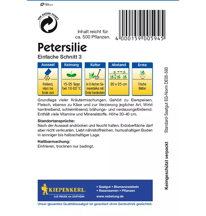 Die Glattblättrige Petersilie 'Einfache Schnitt 3' (Petroselinum crispum) ist eine Kräuterpflanze mit einem aromatischen, würzigen Geschmack. Für das optimale Wachstum der Glattblättrige Petersilie 'Einfache Schnitt 3' werden ein sonniger Standort und durchlässiger, nährstoffreicher Boden benötigt.