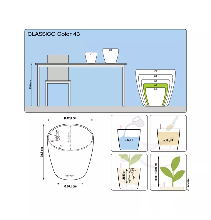 Das beliebte Pflanzgefäß CLASSICO Color darf mit seiner zeitlosen Form und den dezenten matten Farben in keinem Zuhause fehlen. Ob im Innen- oder Außenbereich, CLASSICO Color fügt sich in den unterschiedlichen Größenvarianten wunderbar in jedes Ambiente ein und ist ein Must-Have für alle Pflanzenliebhaber. Dank des integrierten Original LECHUZA Bewässerungssystems versorgen sich die Pflanzen individuell angepasst nach dem Vorbild der Natur mit Feuchtigkeit. Im Außenbereich schützt die herausdrehbare Bodenschraube bei starkem Regen vor Staunässe. Das schlichte Design und die seidenmatte Oberfläche in den harmonischen Farben setzen Zimmer- und Outdoorpflanzen modern in Szene und machen das Pflanzgefäß zu einem unverzichtbaren Partner.