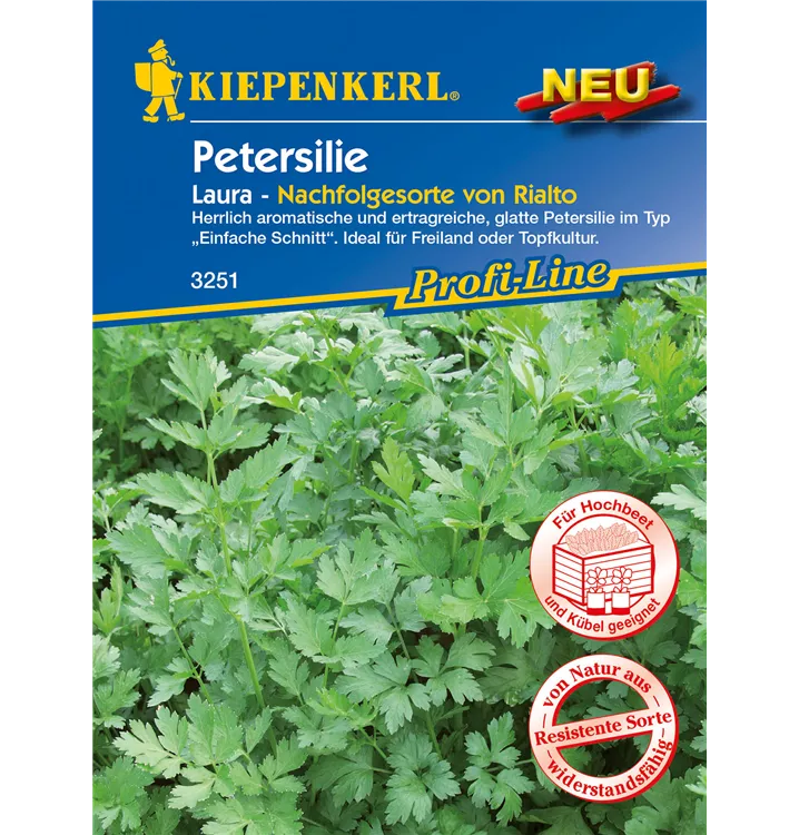 Die Petersilie 'Laura' (Petroselinum crispum) ist eine Kräuterpflanze mit einem aromatischen Geschmack. Ihre dunkelgrünen Blätter sind gefiedert und gesägt. Für das optimale Wachstum der Petersilie 'Laura' werden ein sonniger Standort und durchlässiger, nährstoffreicher Boden benötigt.