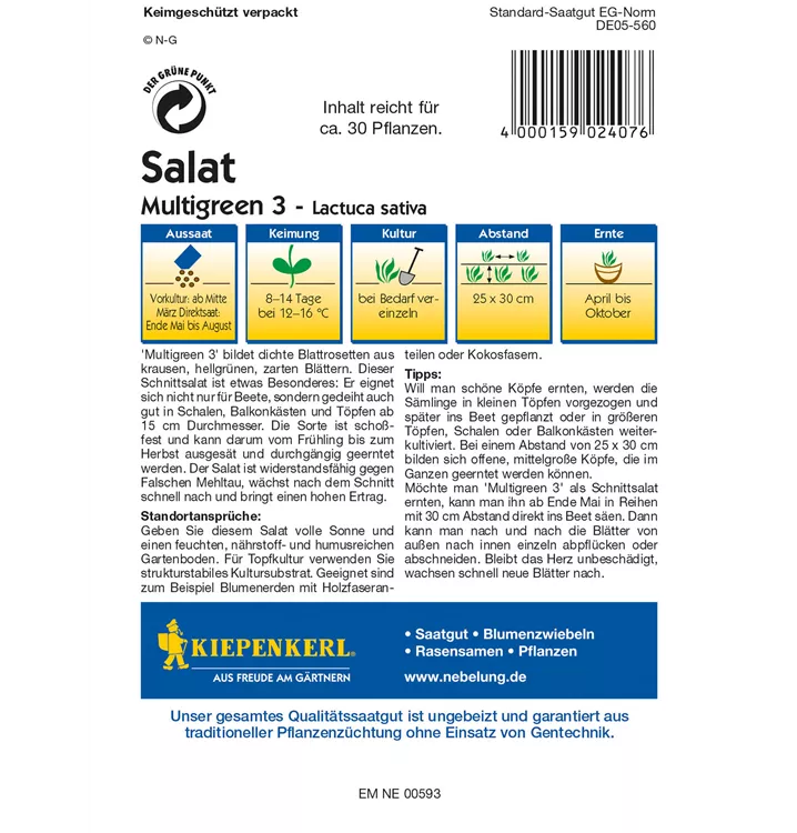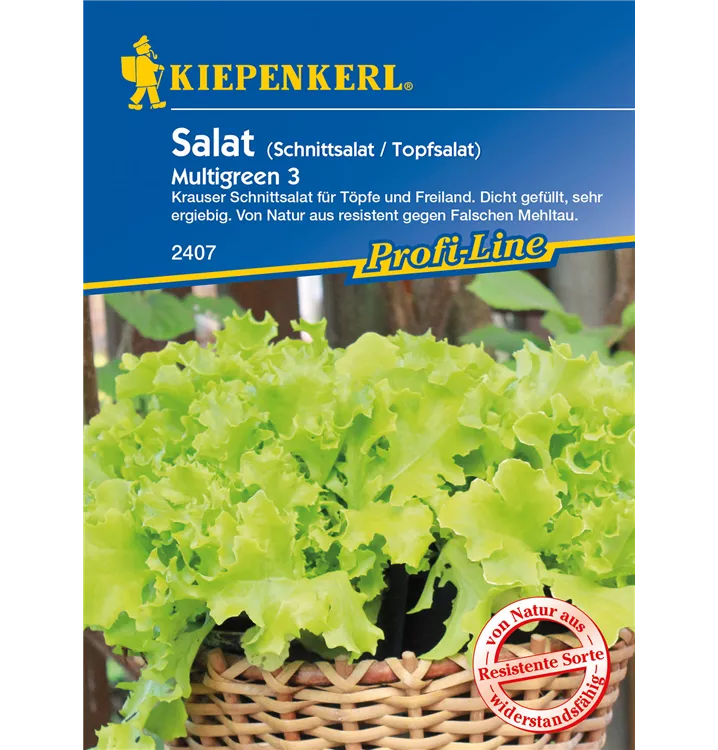 Der Eisbergsalat 'Multigreen 3' (Lactuca sativa) ist eine aromatisch, nussig, bitter schmeckende Gemüsepflanze. Seine Blätter können geerntet werden, sobald er ca. 20 erreicht hat. Für das optimale Wachstum des Eisbergsalats 'Multigreen 3' werden ein sonniger Standort und durchlässiger, nährstoffreicher Boden benötigt.