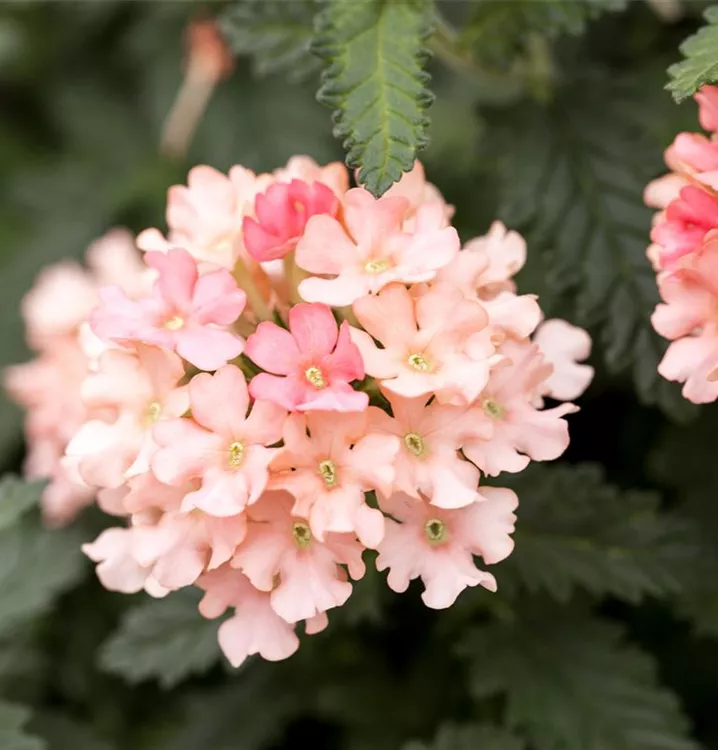 Die Hänge-Verbene Samira® 'Peach' (Verbena) ist eine beliebte Pflanze für den Balkon. Die unzähligen Blüten erscheinen, je nach Sorte, in verschiedenen Farben die ganze Saison hindurch. Ein sonniger Standort und ein durchlässiges Substrat werden bevorzugt.