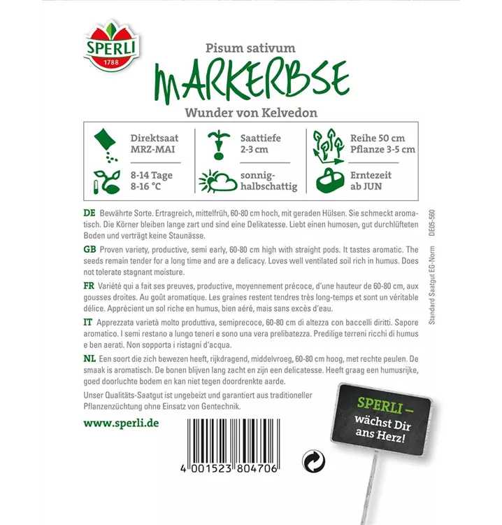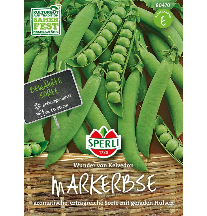 Die Markerbse 'Wunder von Kelvedon' (Pisum sativum) bildet Samenkörner, die süß, aromatisch schmecken und bereits ab Juni geerntet werden können. Für das optimale Wachstum der Markerbse 'Wunder von Kelvedon' werden ein sonniger Standort und durchlässiger, nährstoffreicher Boden benötigt.