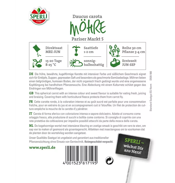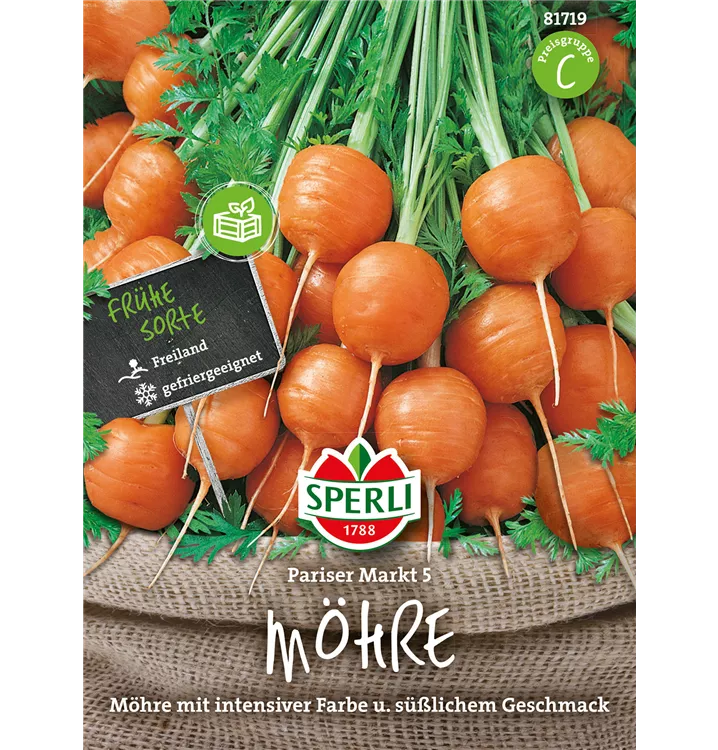 Das Möhre 'Pariser Markt 5' (Daucus carota var. sativus) bildet Wurzeln, die aromatisch schmecken und bereits ab Juni geerntet werden können. Für das optimale Wachstum des Möhres 'Pariser Markt 5' werden ein sonniger Standort und durchlässiger, nährstoffreicher Boden benötigt.