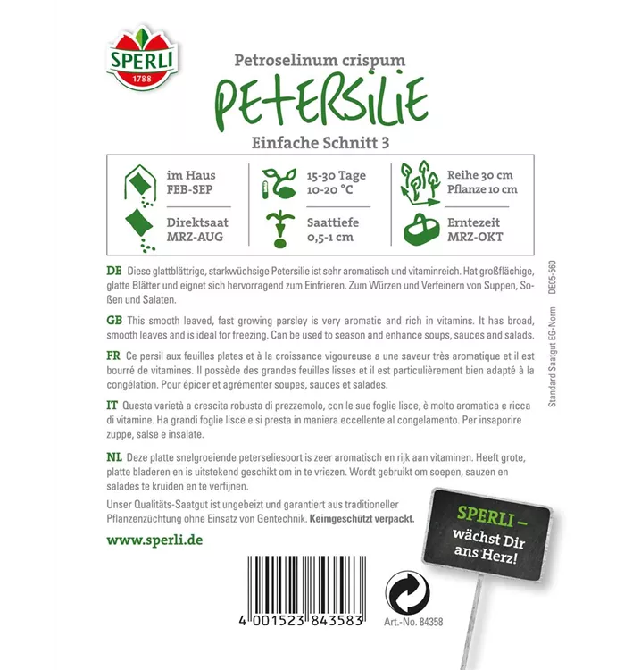 Die Glattblättrige Petersilie 'Einfache Schnitt 3' (Petroselinum crispum) ist eine Kräuterpflanze mit einem aromatischen, würzigen Geschmack. Für das optimale Wachstum der Glattblättrige Petersilie 'Einfache Schnitt 3' werden ein sonniger Standort und durchlässiger, nährstoffreicher Boden benötigt.
