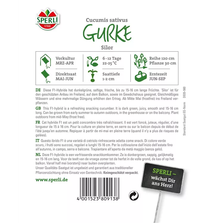 Die Gurke 'Silor F1' (Cucumis sativus) bildet Früchte, die aromatisch schmecken und bereits ab Juni geerntet werden können. Für das optimale Wachstum der Gurke 'Silor F1' werden ein sonniger Standort und durchlässiger, nährstoffreicher Boden benötigt.