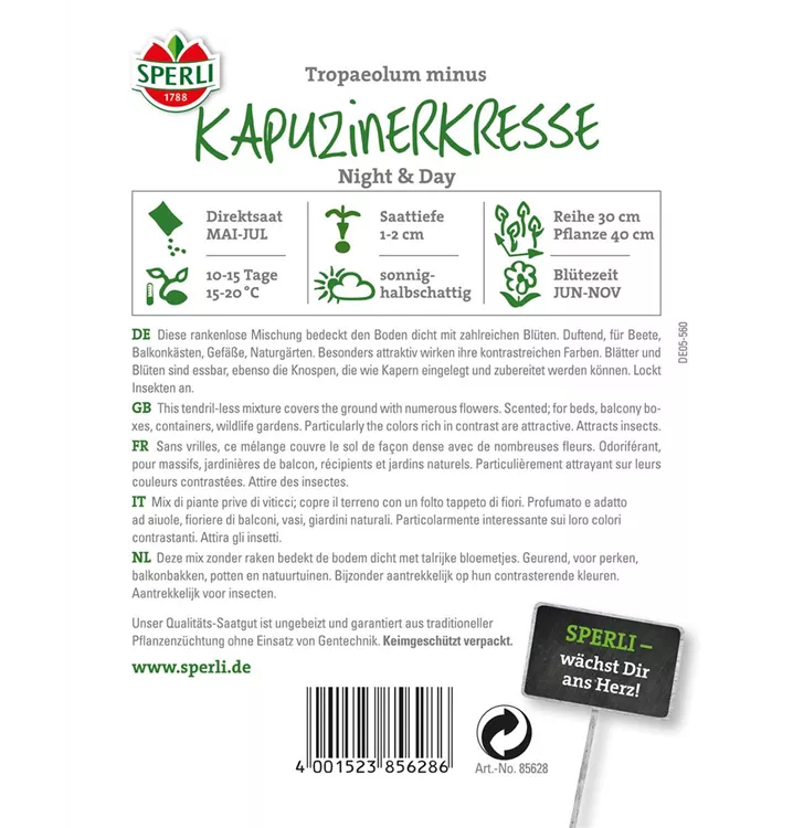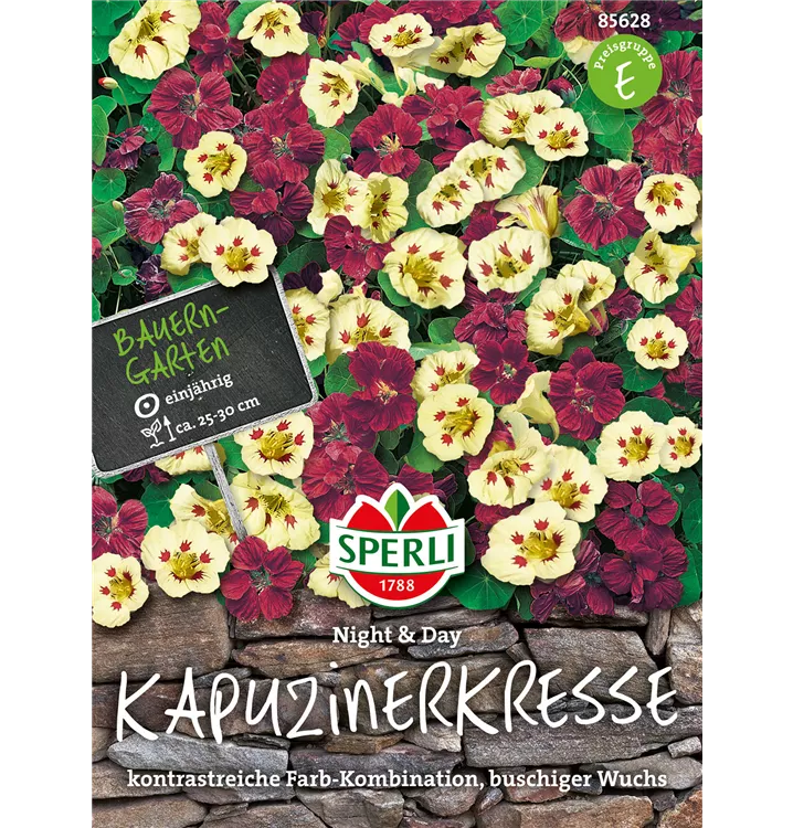 Die Kleine Kapuzinerkresse 'Night and Day' (Tropaeolum minus) ist eine beliebte Pflanze für den Balkon. Die unzähligen Blüten erscheinen, je nach Sorte, in verschiedenen Farben die ganze Saison hindurch. Ein sonniger bis halbschattiger Standort und ein durchlässiges Substrat werden bevorzugt.