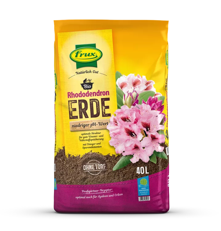 Die frux Rhododendronerde -torffrei- ist eine gebrauchsfertige Pflanzerde für alle Moorbeetpflanzen wie Rhododendren, Azaleen, Eriken, Besenheide usw.Der niedrig eingestellte pH-Wert entspricht den speziellen Anforderungen dieser Pflanzen. Die zugemischten Holzfasern halten den Boden nach dem Pflanzen locker und sichern einen optimalen Luft- und Wasseraustausch, besonders wichtig bei den feinen Wurzeln der Moorbeetpflanzen und für das Anwachsen. Der Anteil an frischem Ton garantieren zudem eine gute Wasser- und Nährstoffspeicherung. Die Erde enthält Dünger und alle für das Pflanzenwachstum notwendigen Spurenelemente. Auch zur begleitenden Pflege von bestehenden Pflanzungen.