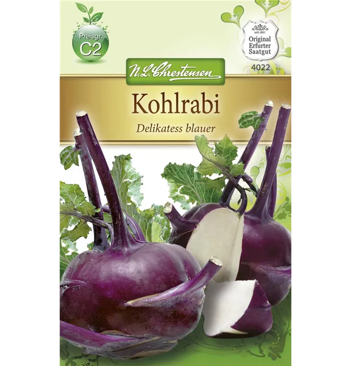 Der Kohlrabi 'Blauer Delikateß' (Brassica oleracea var. gongylodes) bildet Knollen, die aromatisch schmecken und bereits von Juni bis September geerntet werden können. Für das optimale Wachstum des Kohlrabis 'Blauer Delikateß' werden ein sonniger Standort und durchlässiger, nährstoffreicher Boden benötigt.