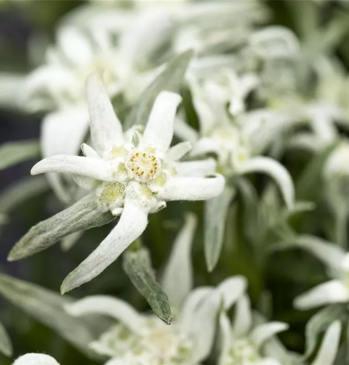 Leontopodium alpinum 'Vroni' bildet sternförmige, silberweiße Blüten ab Juni.