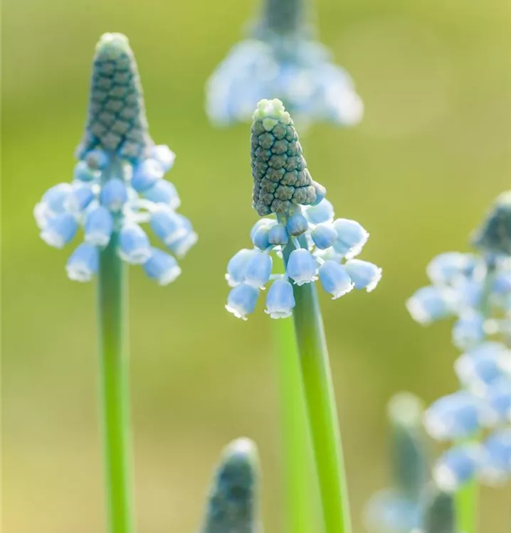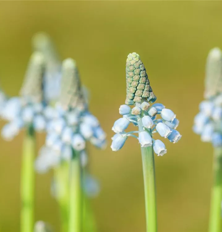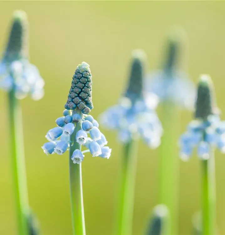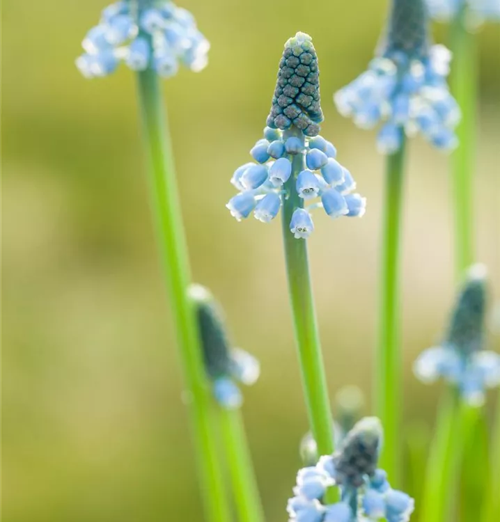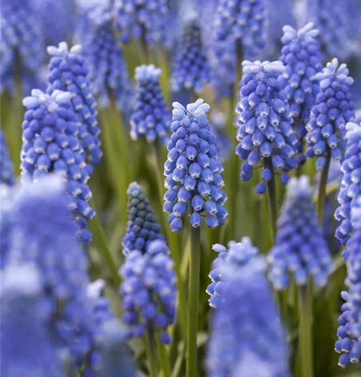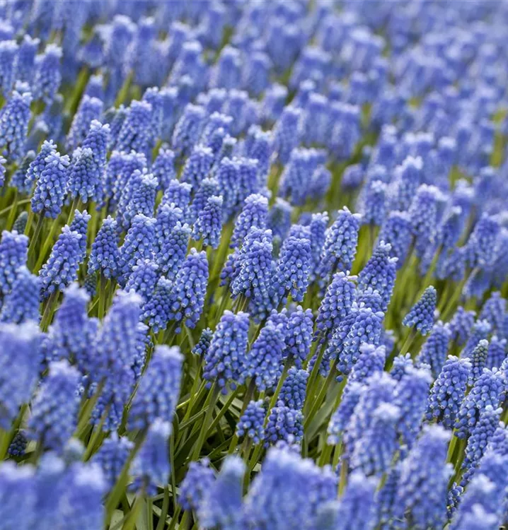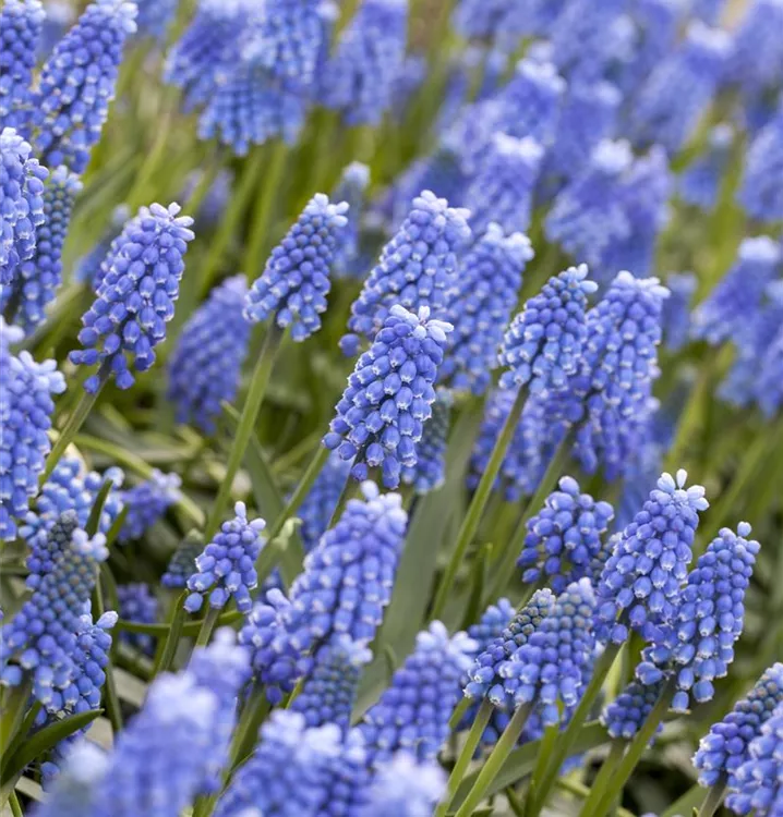 Muscari Traubenhyazinthe in blau, die filigrane Schönheit. Wenn Sie eine Traubenhyazinthe in Ihren Bauerngarten gepflanzt haben, dann können Sie von März bis Juni jederzeit einen strahlenden blauen oder weißen Blumenstrauß ernten. Beide Farbtypen passen auch gut nebeneinander als Gruppenbepflanzung in ein Beet. Wie Perlen in einem schönen Schmuckstück wirken die Blütentrauben. Die Pflanze wächst schön gerade und die Triebe stehen eng beieinander. Daher kann sie auch zu einer bezaubernden Kübel-Existenz werden.