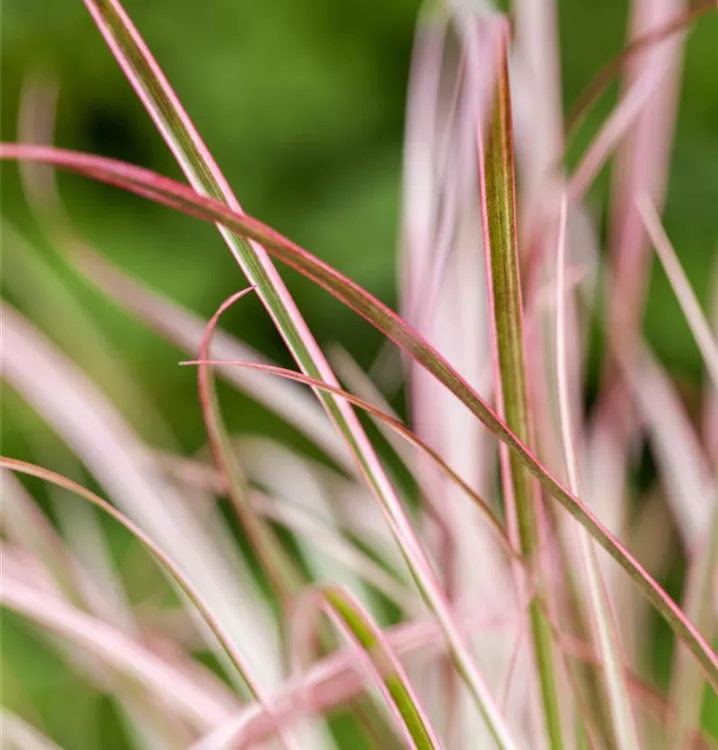 Pennisetum setaceum Fireworks(s) ist ein sehr wärmeliebendes Federborstengras. Die im Neuaustrieb weißen Halme mit breitem grünen Saum färben sich mit dem Alter innen purpurrot und außen leuchtend pink. Kompakter als Rubrum. Im Sommer erscheinen rötliche Lampenputzer. Nicht winterhart!
