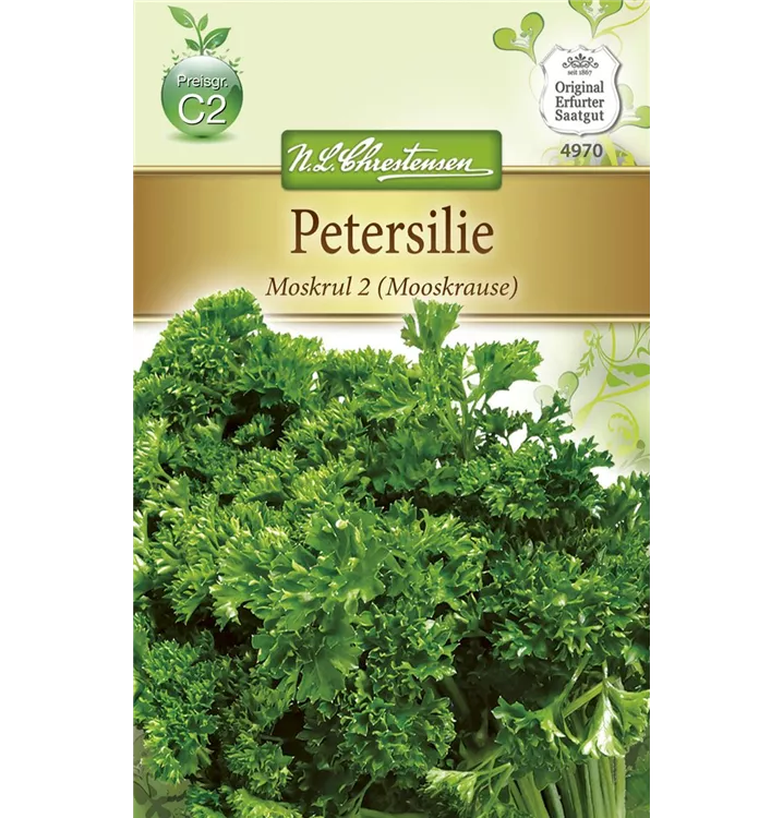 Die Krause Petersilie 'Mooskrause 2' (Petroselinum crispum) ist eine Kräuterpflanze mit einem aromatischen, würzigen Geschmack. Ihre dunkelgrünen Blätter sind gefiedert und gewellt. Für das optimale Wachstum der Krause Petersilie 'Mooskrause 2' werden ein sonniger Standort und durchlässiger, nährstoffreicher Boden benötigt.