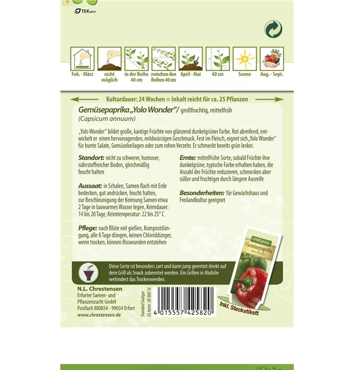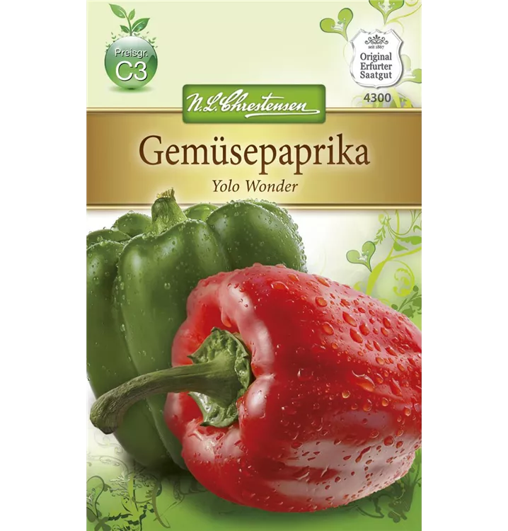 Der Paprika 'Yolo Wonder B' (Capsicum annuum) bildet Früchte, die würzig, mild schmecken und bereits ab August geerntet werden können. Für das optimale Wachstum des Paprikas 'Yolo Wonder B' werden ein sonniger Standort und durchlässiger, nährstoffreicher Boden benötigt.