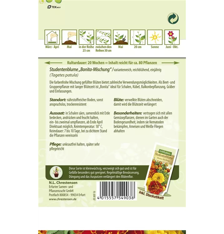 Die Studentenblume 'Bonita-Mischung' ist als Kübelpflanze, aber auch als Schnittpflanze, als Grabbepflanzung, als Beeteinfassung, auf Balkon oder Terrasse oder in Klein- und Vorgärten sehr beliebt.