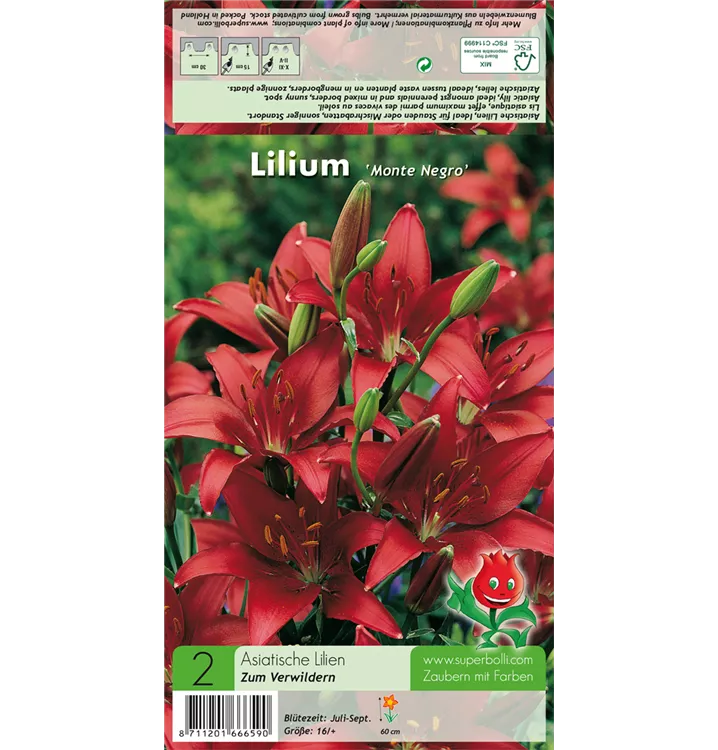 Welch eine Pracht, wenn die Asiatische Lilie 'Monte Negro' ab Juli ihre herrlichen, roten, trichterförmigen Blüten hervorbringt! Das Besondere: sie verbreiten einen angenehmen Duft. Über den dunkelgrünen, lanzettlichen Blättern kommen die Blüten besonders gut zur Geltung. Wird Lilium 'Monte Negro' an einen sonnigen bis halbschattigen Standort mit durchlässigem und humosem Boden gepflanzt, entwickelt sie sich besonders gut. Sie wächst aufrecht und erreicht Größen von 40 cm bis 60 cm bei einer Breite von 20 cm bis 30 cm. Sehr dekorativ macht sich die Asiatische Lilie 'Monte Negro' auch in Kübeln oder Kästen. Lilium 'Monte Negro' hat sich als besonders pflegeleicht erwiesen.