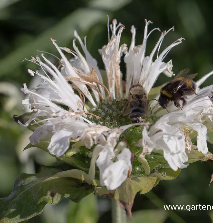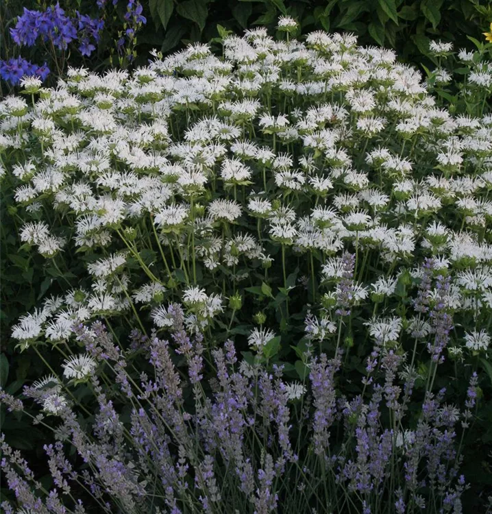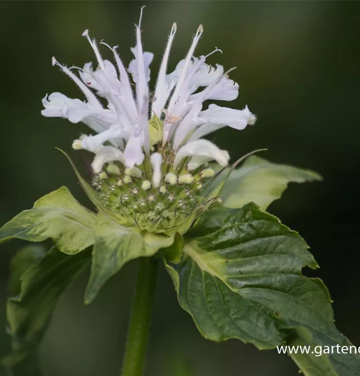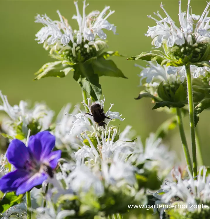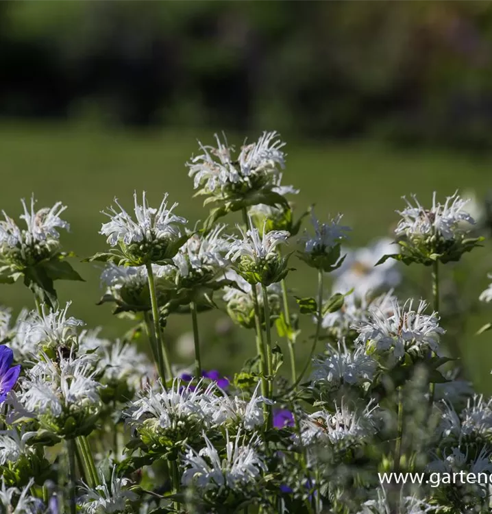 Monarda fistulosa 'Schneewittchen' bildet lippenförmige, in Quirlen angeordnete, weiße Blüten ab Juni.