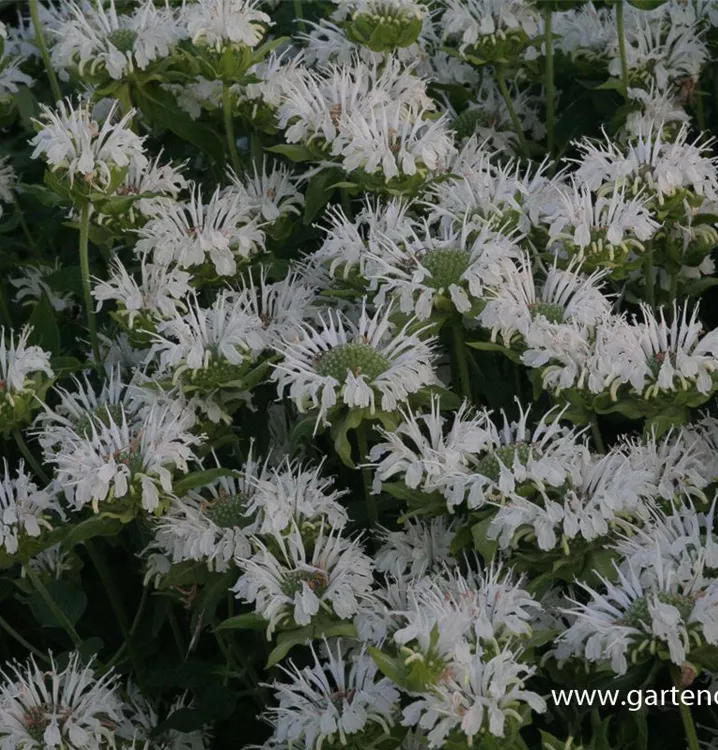 Die Garten-Indianernessel 'Schneewittchen' (Monarda fistulosa) ist eine aufrechte, verzweigte Staude, die von Juni bis August weiße, lippenförmige, in Quirlen angeordnete Blüten bildet. An einem sonnigen Standort mit durchlässigem, nährstoffreichem Boden erreicht sie gewöhnlich eine Höhe von ca. 1,2 m und wird ca. 60 cm breit. Die Garten-Indianernessel 'Schneewittchen' ist gut frostverträglich.