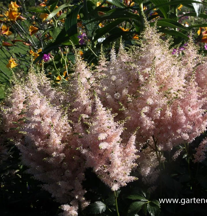 Astilbe japonica 'Europa' bildet in Rispen angeordnete, hellrosafarbene Blüten ab Juni.