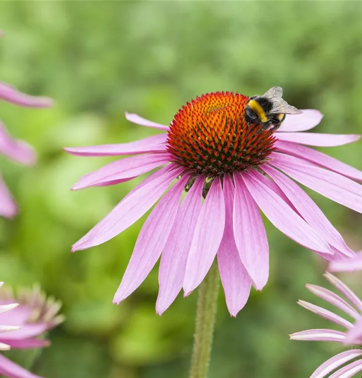 Echinacea purpurea 'Magnus' bildet körbchenartige, dunkelrote Blüten ab Juli.