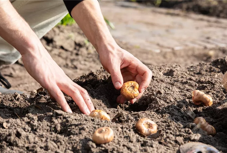 Vor dem Pflanzen sollte gut geplant werden, in welchen Bereichen des Gartens die Blumenzwiebeln im Herbst ausgebracht werden. Außerdem ist es wichtig, dass der Boden für die Zwiebelblüher vorbereitet wird. Sie verfügen über feine Wurzeln, die kaum die Kraft besitzen, einen Lehmboden oder ein festes Substrat zu durchdringen. Es ist daher erfolgversprechend, das Erdreich bis zu einer Tiefe von 30 Zentimetern aufzulockern. Das Einarbeiten einer Drainageschicht kann bei schweren Böden hilfreich sein, Staunässe zu vermeiden. Mit dem Auflockern des Substrats hat man bereits viel geschafft, damit Blumenzwiebeln, die im Herbst ausgebracht werden, im Frühjahr gut anwachsen. Sie können bis zu drei Jahre im Boden verbleiben, sodass sich gute Vorarbeit auszahlt.