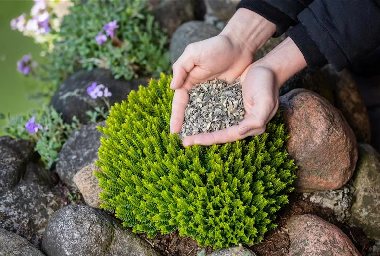 Da die Pflanzen im Hochbeet auf eine begrenzte Menge an Erde angewiesen sind, ist bei der Pflanzenpflege im Hochbeet das Düngen eine wichtige Aufgabe. Auch im Hochbeet müssen die Pflanzen ausreichend Nährstoffe, wie Stickstoff, Phosphor und Kalium sowie Magnesium, Kalzium, Bor, Eisen, Zink und weitere Spurenelemente bekommen. Um diesen Bedarf abzudecken, gibt es organische und mineralische Dünger, die vor allem bei Hochbeeten wichtig sind, die nicht mit Komposterde gefüllt wurden. Bei organischen Düngern erfolgt die Abgabe der Nährstoffe langsam und gleichmäßig, während mineralische Dünger wasserlöslich sind und schnell wirken können. Da die Pflanzen Feuchtigkeit benötigen, um die Nährstoffe aufzunehmen, sollte bei der Pflanzenpflege im Hochbeet nach dem Düngen das Gießen nicht vergessen werden.